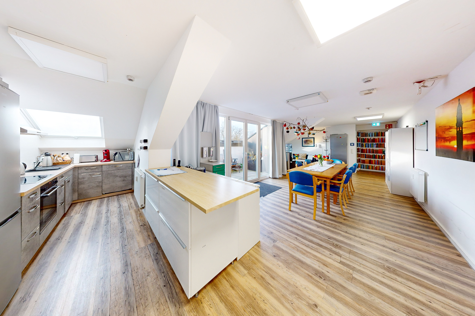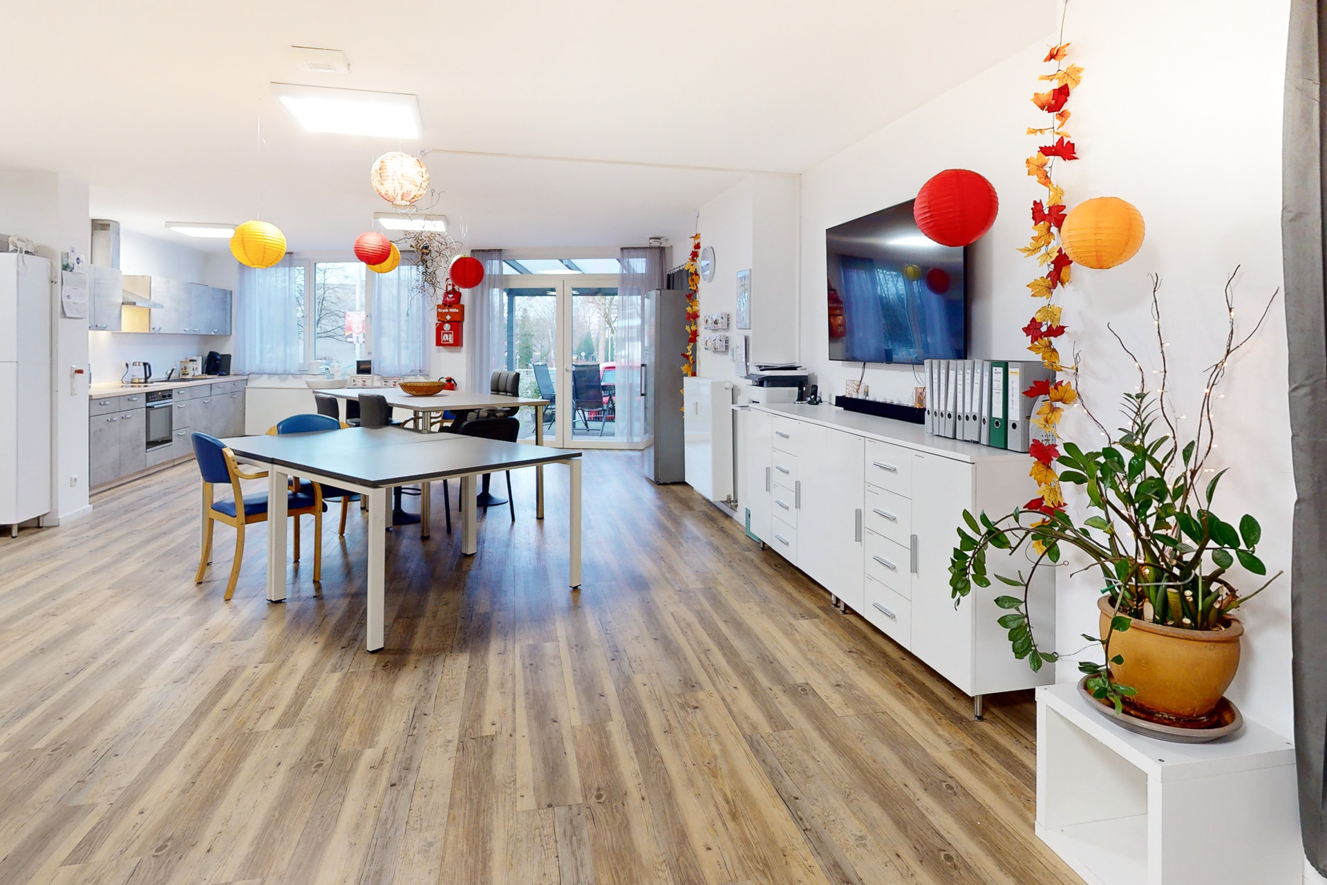 Der zentrale Gemeinschaftsraum ist das lebendige Herz der Wohngemeinschaft – ein Ort, an dem Zusammenhalt und Freude am Leben spürbar werden. Hier wird der Alltag aktiv und gemeinsam gestaltet: Ob beim Spielen, kreativen Gestalten oder gemeinsamen Kochen – jede Aktivität bringt Abwechslung und Momente des Glücks. Besonders zauberhaft sind die Augenblicke, in denen wir zusammen musizieren, Bewegungsübungen machen oder festliche Anlässe wie Geburtstage oder Weihnachten feiern. Jeder Tag wird durch das Miteinander bereichert und gewinnt so eine ganz eigene Bedeutung.